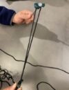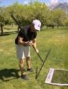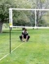 1.Find the centre hole in the two yellow sideline markers (the no-spike zone holes are each 5′ from the centre hole) and using a boundary stake secure it to the ground on the outside edge of the net frame.